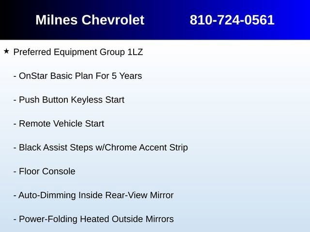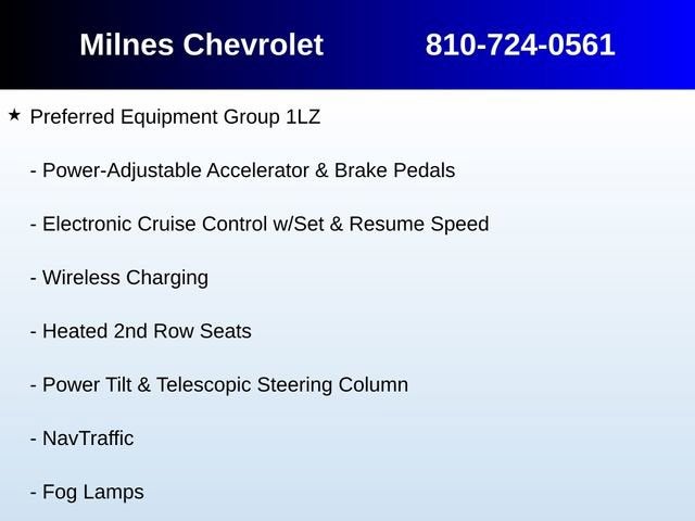 4WD, Jet Black Leather, 1st & 2nd Row Color-Keyed Carpeted Floor Mats, 3rd Row 60/40 Power Fold Split-Bench, 4-Wheel Antilock Disc Brakes w/Brake Assist, Auto-Dimming Inside Rear-View Mirror, Black Assist Steps w/Chrome Accent Strip, Bose Centerpoint Premium 10-Speaker Surround Sound, Color-Keyed Carpeting Floor Covering, Driver Inboard & Front Passenger Airbags, Electronic Cruise Control w/Set & Resume Speed, Enhanced Driver Alert Package (Y86), Enhanced Driver Information Center, Floor Console, Fog Lamps, Forward Collision Alert Sensor Indicator, Front & Rear Parking Assist, Hands Free Power Liftgate, Heated 2nd Row Seats, Heated Leather Wrapped Steering Wheel, IntelliBeam Headlamps, Lane Keep Assist, Low Speed Forward Automatic Braking, Memory Settings, NavTraffic, OnStar Basic Plan For 5 Years, Passive Entry System, Power Release 2nd Row Bucket Seats, Power Tilt & Telescopic Steering Column, Power-Adjustable Accelerator & Brake Pedals, Power-Folding Heated Outside Mirrors, Preferred Equipment Group 1LZ, Push Button Keyless Start, Rear Cross-Traffic Alert, Remote Keyless Entry, Remote Vehicle Start, Roof-Mounted Luggage Rack Side Rails, Side Blind Zone Alert w/Lane Change Alert, SiriusXM Satellite Radio, Universal Home Remote, Wireless Charging, 10 Speakers, 3rd row seats: split-bench, 4-Wheel Disc Brakes, 5 12-Volt Auxiliary Power Outlets, 6-Way Power Front Passenger Seat Adjuster, ABS brakes, Adaptive suspension, Adjustable pedals, Air Conditioning, All-Weather Floor Mats, All-Weather Rear Cargo Mat (LPO), Alloy wheels, AM/FM radio: SiriusXM, Apple CarPlay/Android Auto, Auto High-beam Headlights, Auto-dimming door mirrors, Auto-dimming Rear-View mirror, Automatic temperature control, Bodyside moldings, Brake assist, Bumpers: body-color, Cargo Net, CD player, Compass, Delay-off headlights, Driver door bin, Driver vanity mirror, Dual front impact airbags, Dual front side impact airbags, Electronic Stability Control, Emergency communication system: OnStar Guidance, Exterior Parking Camera Rear, Front anti-roll bar, Front Bucket Seats, Front Center Armrest, Front dual zone A/C, Front fog lights, Front Heated Reclining Bucket Seats, Front reading lights, Front wheel independent suspension, Fully automatic headlights, Garage door transmitter, Heated & Vented Driver & Front Passenger Seats, Heated door mirrors, Heated front seats, Heated rear seats, Heated steering wheel, High-Intensity Discharge Headlights, Illuminated entry, Integrated Trailer Brake Controller, Interior Protection Package (LPO), Low tire pressure warning, Magnetic Ride Control Suspension Package, Max Trailering Package, Memory seat, Navigation System, Occupant sensing airbag, Outside temperature display, Overhead airbag, Overhead console, Panic alarm, Passenger door bin, Passenger vanity mirror, Pedal memory, Perforated Leather-Appointed Seat Trim, Power door mirrors, Power driver seat, Power Liftgate, Power passenger seat, Power steering, Power Sunroof, Power windows, Premium audio system: Chevrolet MyLink, Radio: Chevrolet MyLink w/Nav/AM/FM Stereo, Rain sensing wipers, Rear air conditioning, Rear anti-roll bar, Rear reading lights, Rear Seat Blu-Ray/DVD Entertainment System, Rear window defroster, Rear window wiper, Remote keyless entry, Roof rack: rails only, Security system, Single-Slot CD/MP3 Player, Speed control, Speed-sensing steering, Split folding rear seat, Spoiler, Steering wheel memory, Steering wheel mounted audio controls, Sun, Entertainment & Destinations Package, Tachometer, Telescoping steering wheel, Tilt steering wheel, Traction control, Trip computer, Turn signal indicator mirrors, Variably intermittent wipers, Ventilated front seats, Voltmeter, Wheels: 20 x 9 Polished-Aluminum, Wheels: 22 x 9 Ultra Bright Machined Aluminum, 4WD, Jet Black Le