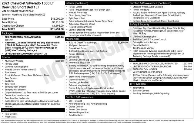 CARFAX One-Owner. 2021 Chevrolet Silverado 1500 LT LT1 Northsky Blue Metallic 3.0L I6 10-Speed Automatic 4WD 4D Crew Cab