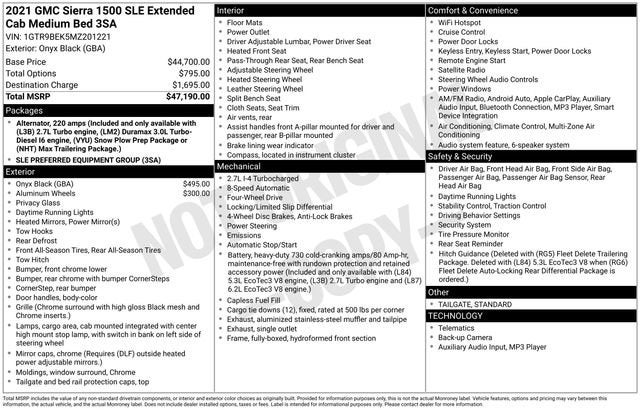 2021 GMC Sierra 1500 SLE Onyx Black 2.7L Turbo 8-Speed Automatic 4WD Double Cab