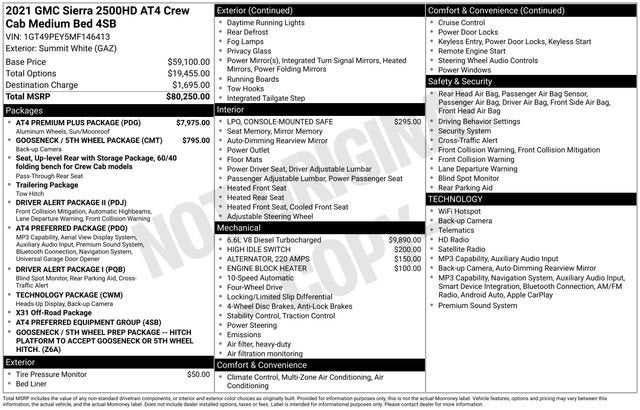 10-Speed Automatic, 4WD, Jet Black With Kalahari Accents Leather, 10-Way Power Driver Seat Adjuster w/Lumbar, 10-Way Power Passenger Seat Adjuster w/Lumbar, 12-Volt Rear Auxiliary Power Outlet, 120-Volt Bed Mounted Power Outlet, 120-Volt Instrument Panel Power Outlet, 18 Machined Aluminum Wheels, 2 USB Ports, 2 USB Ports (1st Row), 2-Speed Active Transfer Case, 20 Machined Aluminum Wheels, 220 Amps Alternator, 2nd Row Dual USB Charge-Only Ports, 4-Wheel Disc Brakes, 4.2 Diagonal Color Display Driver Info Center, 4G LTE Wi-Fi Hotspot Capable, 6 Speakers, 6-Speaker Audio System Feature, 8 Multicolor Driver Information Center, ABS brakes, Air Conditioning, Alloy wheels, AM/FM radio: SiriusXM with 360L, Apple CarPlay/Android Auto, AT4 High Clearance Step (LPO), AT4 Preferred Package, AT4 Premium Plus Package, Auto-dimming door mirrors, Auto-dimming Rear-View mirror, Automatic Emergency Braking, Automatic temperature control, Bed View Camera w/2 Trailer Camera Provisions, Bose Premium 7 Speaker Sound System, Brake assist, Bumpers: body-color, Compass, Compass Located In Instrument Cluster, Console-Mounted Safe (LPO), Deep-Tinted Glass, Delay-off headlights, Driver Alert Package I, Driver Alert Package II, Driver door bin, Driver Memory, Driver vanity mirror, Dual front impact airbags, Dual front side impact airbags, Electric Rear-Window Defogger, Electrical Lock Control Steering Column, Electronic Stability Control, Engine Block Heater, Exhaust Brake, Floor-Mounted Center Console, Following Distance Indicator, Forward Collision Alert, Front anti-roll bar, Front Bucket Seats, Front Center Armrest, Front dual zone A/C, Front fog lights, Front Prem Floor Liners w/Removable Carpet Insert, Front reading lights, Front wheel independent suspension, Fully automatic headlights, GMC Connected Access Capable, Gooseneck/5th Wheel Package, Gooseneck/5th Wheel Prep Package, HD Radio, HD Rear Vision Camera, HD Surround Vision, Heated & Ventilated Front Bucket Seats, Heated 2nd Row Outboard Seats, Heated door mirrors, Heated Driver & Front Outboard Passenger Seats, Heated front seats, Heated rear seats, Heated steering wheel, Heavy-Duty 80 Amp Battery, High Idle Switch, Hill Descent Control, Hitch Guidance w/Hitch View, Illuminated entry, In-Vehicle Trailering System App, Inside Rearview Auto-Dimming Rear Camera Mirror, Integrated Trailer Brake Controller, IntelliBeam Automatic High Beam On/Off, Keyless Open & Start, Lane Change Alert w/Side Blind Zone Alert, Lane Departure Warning System, LED Cargo Area Lighting, LED Smoked Amber Roof Marker Lamps, Low tire pressure warning, Manual Tilt-Wheel/Telescoping Steering Column, Memory seat, Multicolor 15 Diagonal Head-Up Display, Occupant sensing airbag, Off-Road Suspension, OnStar & GMC Connected Services Capable, Outside temperature display, Overhead airbag, Overhead console, Painted Black Surround Grille, Panic alarm, Passenger door bin, Passenger vanity mirror, Perforated Leather-Appointed Front Seat Trim, Pickup Box, Power Door Locks, Power door mirrors, Power driver seat, Power Front Passenger Windows w/Express Up/Down, Power passenger seat, Power Rear Windows w/Express Down, Power Sliding Rear Window w/Defogger, Power steering, Power Sunroof, Power windows, Power Windows w/Driver Express Up/Down, Preferred Equipment Group 4SB, Premium audio system: Premium GMC Infotainment System, Radio: AM/FM w/Premium GMC Infotainment System, Radio: Premium GMC Infotainment Sys w/Navigation, Rear Cross Traffic Alert, Rear Prem Floor Liners w/Removable Carpet Insert, Rear reading lights, Rear seat center armrest, Rear step bumper, Rear Wheelhouse Liners, Rear window defroster, Remote keyless entry, Remote Vehicle Starter System, Safety Alert Seat, Security system, SiriusXM w/360L, Speed control, Speed-sensing steering, Spli