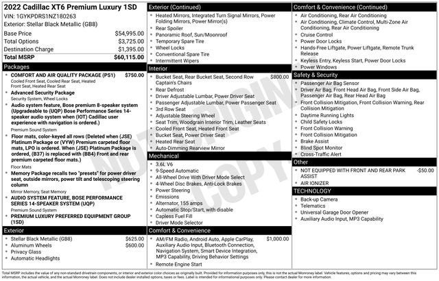 2-Way Power Driver Lumbar Control Seat Adjuster, 2-Way Power Passenger Lumbar Control Seat Adjuster, 3.49 Axle Ratio, 3rd row seats: split-bench, 4-Wheel Disc Brakes, 6-Passenger Seating, 8 Speakers, ABS brakes, Air Conditioning, Air Ionizer, Alloy wheels, AM/FM radio: SiriusXM with 360L, Audio memory, Auto High-beam Headlights, Auto tilt-away steering wheel, Auto-dimming door mirrors, Auto-dimming Rear-View mirror, Automatic Emergency Braking, Automatic Stop/Start w/Disable, Automatic temperature control, Bose Performance Series Audio System, Bose Premium 8-Speaker Audio System, Brake assist, Bumpers: body-color, Comfort & Air Quality Package, Compass, Delay-off headlights, Driver & Front Passenger Heated Seats, Driver door bin, Driver vanity mirror, Dual Driver Information Center Display, Dual front impact airbags, Dual front side impact airbags, Electronic Stability Control, Emergency communication system: OnStar and Cadillac connected services capable, Four wheel independent suspension, Front & Rear Park Assist, Front anti-roll bar, Front Bucket Seats, Front Center Armrest, Front dual zone A/C, Front reading lights, Fully automatic headlights, Garage door transmitter, Heated door mirrors, Heated front seats, Heated Rear Outboard Seating Positions, Heated steering wheel, Illuminated entry, Inside Rear-View Auto-Dimming Mirror, Knee airbag, Leather Seating Surfaces w/Mini-Perforated Inserts, Leather steering wheel, Low tire pressure warning, Memory seat, Not Equipped w/Front & Rear Park Assist, Occupant sensing airbag, Outside temperature display, Overhead airbag, Overhead console, Panic alarm, Passenger door bin, Passenger vanity mirror, Power door mirrors, Power driver seat, Power Liftgate, Power moonroof: UltraView, Power passenger seat, Power steering, Power windows, Premium Luxury Package 1SD, Radio data system, Radio: Cadillac User Experience AM/FM Stereo, Radio: Cadillac User Experience w/Embedded Nav, Rain sensing wipers, Rear air conditioning, Rear anti-roll bar, Rear reading lights, Rear seat center armrest, Rear window defroster, Rear window wiper, Remote keyless entry, Ride & Handling Suspension, Roof rack: rails only, Security system, SiriusXM w/360L, Speed control, Speed-sensing steering, Split folding rear seat, Spoiler, Steering wheel memory, Steering wheel mounted audio controls, Tachometer, Teen Driver, Telescoping steering wheel, Tilt steering wheel, Traction control, Trip computer, Turn signal indicator mirrors, Variably intermittent wipers, Ventilated Driver & Front Passenger Seats, Voltmeter, Wheels: 20 12-Spoke Alloy w/Fully Polished Finish, Wheels: 20 6-Split Spoke Alloy.