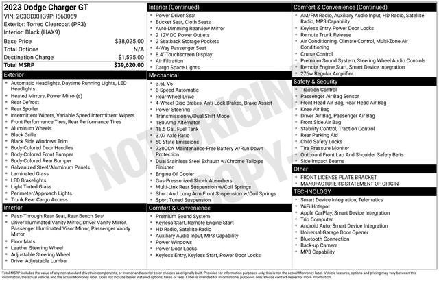 2023 Dodge Charger GT Torred Clearcoat 3.6L V6 24V VVT 8-Speed Automatic RWD 4D SedanBlack Cloth, 1-Yr SiriusXM Guardian Trial, 2-Piece Shark Fin Antenna, 4-Wheel Disc Brakes, 4G LTE Wi-Fi Hot Spot, 6 Speakers, 8.4 Touchscreen Display, ABS brakes, Air Conditioning, Alloy wheels, AM/FM radio: SiriusXM, Anti-whiplash front head restraints, Apple CarPlay, Apple CarPlay/Android Auto, Auto-dimming Rear-View mirror, Automatic temperature control, Brake assist, Bumpers: body-color, Cloth Performance Seats, Compass, Delay-off headlights, Driver door bin, Driver vanity mirror, Dual front impact airbags, Dual front side impact airbags, Electronic Stability Control, Emergency communication system: SiriusXM Guardian, For Details, Visit DriveUconnect.com, Four wheel independent suspension, Front anti-roll bar, Front Bucket Seats, Front Center Armrest, Front dual zone A/C, Front License Plate Bracket, Front reading lights, Fully automatic headlights, Garage door transmitter: HomeLink, Google Android Auto, GPS Antenna Input, HD Radio, Heated door mirrors, Illuminated entry, Integrated Center Stack Radio, Integrated Voice Command w/Bluetooth®, Knee airbag, Leather Shift Knob, Low tire pressure warning, Manufacturer's Statement of Origin, Media Hub (2 USB, AUX), Occupant sensing airbag, Outside temperature display, Overhead airbag, Overhead console, Panic alarm, ParkView Rear Back-Up Camera, Passenger door bin, Passenger vanity mirror, Power 2-Way Driver Lumbar Adjust, Power 8-Way Driver Seat, Power door mirrors, Power driver seat, Power steering, Power windows, Radio: Uconnect 4C w/8.4 Display, Rear anti-roll bar, Rear Armrest w/Cupholder Seat, Rear reading lights, Rear seat center armrest, Rear window defroster, Remote keyless entry, Speed control, Speed-Sensitive Wipers, Split folding rear seat, Spoiler, Steering wheel mounted audio controls, Tachometer, Telescoping steering wheel, Tilt steering wheel, Traction control, Trip computer, USB Host Flip, Variably intermittent wipers, Wheels: 20 x 8 Satin Carbon Painted, Black Cloth. 19/30 City/Highway MPG
