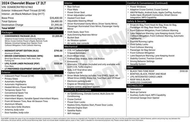 170 Amp Alternator, 1st & 2nd Row All-Weather Floor Liners (LPO), 3.47 Final Drive Axle Ratio, 4-Way Manual Front Passenger Seat Adjuster, 4-Wheel Disc Brakes, 6 Speakers, 6-Speaker Audio System Feature, 8-Way Power Driver Seat Adjuster, ABS brakes, Adaptive Cruise Control, Air Conditioning, Alloy wheels, AM/FM radio: SiriusXM with 360L, Apple CarPlay/Android Auto, Auto High-beam Headlights, Automatic temperature control, Black 2-Tone Roof, Black Roof-Mounted Side Rails, Brake assist, Bumpers: body-color, Child-Seat-Sensing Airbag, Compass, Convenience Package, Delay-off headlights, Driver Confidence Package, Driver door bin, Driver vanity mirror, Dual front impact airbags, Dual front side impact airbags, Electronic Stability Control, Emergency communication system: OnStar and Chevrolet connected services capable, Enhanced Automatic Emergency Braking, Floor Liner Package (LPO), Four wheel independent suspension, Front & Rear Black Bowties, Front anti-roll bar, Front Bucket Seats, Front Center Armrest, Front dual zone A/C, Front reading lights, Fully automatic headlights, Heated door mirrors, Heated Driver & Front Passenger Seats, Heated front seats, Illuminated entry, Inside Rear-View Auto-Dimming Mirror, Integrated Cargo Liner (LPO), Knee airbag, Lane Change Alert w/Side Blind Zone Alert, Leather Shift Knob, Low tire pressure warning, Midnight/Sport Edition, Occupant sensing airbag, Outside temperature display, Overhead airbag, Overhead console, Panic alarm, Passenger door bin, Passenger vanity mirror, Power door mirrors, Power Driver Lumbar Control, Power driver seat, Power steering, Power windows, Preferred Equipment Group 2LT, Premium audio system: Chevrolet Infotainment 3 Plus, Premium Cloth Seat Trim, Radio data system, Radio: Chevrolet Infotainment 3 Plus System, Rear anti-roll bar, Rear Cross Traffic Alert, Rear Park Assist w/Audible Warning, Rear Power Programmable Liftgate, Rear reading lights, Rear seat center armrest, Rear window defroster, Rear window wiper, Remote keyless entry, Ride & Handling Suspension, Security system, SiriusXM w/360L, Speed control, Speed-sensing steering, Split folding rear seat, Spoiler, Steering wheel mounted audio controls, Tachometer, Telescoping steering wheel, Tilt steering wheel, Traction control, Trip computer, Universal Home Remote, Variably intermittent wipers, Voltmeter, Wheels: 18 Grazen Metallic Aluminum, Wheels: 18 High Gloss Black Painted Aluminum, Wireless Charging. 22/29 City/Highway MPG