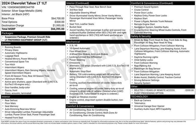 4WD, Black Leather, 10-Way Power Driver & Passenger Seat Adjusters, 1st & 2nd Row Color-Keyed Carpeted Floor Mats, 3.23 Rear Axle Ratio, 3rd row seats: split-bench, 4-Wheel Disc Brakes, 9 Speakers, ABS brakes, Air Conditioning, Alloy wheels, AM/FM radio: SiriusXM with 360L, Apple CarPlay/Android Auto, Auto High-beam Headlights, Auto-Dimming Inside Rear-View Mirror, Auto-dimming Rear-View mirror, Automatic temperature control, Bose 9-Speaker Stereo Audio System Feature, Brake assist, Bright Front & Rear Door Sill Plates, Bumpers: body-color, Color-Keyed Carpeting Floor Covering, Compass, Delay-off headlights, Deleted 3 Years of OnStar Remote Access, Driver & Front Outboard Passenger Airbags, Driver door bin, Driver vanity mirror, Dual front impact airbags, Dual front side impact airbags, Electronic Stability Control, Emergency communication system: OnStar and Chevrolet connected services capable, Enhanced Driver Information Center, Floor Console w/Storage Area, Four wheel independent suspension, Front anti-roll bar, Front Bucket Seats, Front Center Armrest, Front dual zone A/C, Front High-Back Reclining Bucket Seats, Front reading lights, Fully automatic headlights, Garage door transmitter, Hands-Free Rear Power Programmable Liftgate, Heated door mirrors, Heated Driver & Front Passenger Seats, Heated front seats, Illuminated entry, Infotainment Display, Leather-Appointed Seat Trim, LED Daytime Running Lamps, Low tire pressure warning, Memory seat, Memory Settings for Driver, Navigation System, Occupant sensing airbag, Outside temperature display, Overhead airbag, Overhead console, Panic alarm, Passenger door bin, Passenger vanity mirror, Power door mirrors, Power driver seat, Power Liftgate, Power passenger seat, Power steering, Power windows, Preferred Equipment Group 1LT, Premium audio system: Chevrolet Infotainment 3 Premium, Premium Smooth Ride Suspension, Radio: Chevrolet Infotainment 3 Premium System, Rain sensing wipers, Rear air conditioning, Rear anti-roll bar, Rear reading lights, Rear seat center armrest, Rear window defroster, Rear window wiper, Remote keyless entry, Remote Start, Roof rack: xxxxxx, Security system, SiriusXM w/360L, Speed control, Speed-sensing steering, Split folding rear seat, Spoiler, Steering wheel mounted audio controls, Tachometer, Telescoping steering wheel, Tilt steering wheel, Traction control, Trip computer, Universal Home Remote, Variably intermittent wipers, Voltmeter, Wheels: 18 x 8.5 Bright Silver Painted Aluminum, Wireless Charging, Wrapped Steering Wheel, 4WD, Black Leather.